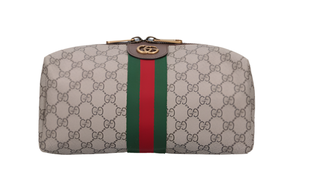 Pouch media "Savoy" Gucci, in tela beige, motivo "GG Supreme", chiusura zip, dettaglio nastro "Web" verde e rosso applicato, dettaglio patch logo metallico, finiture in pelle marrone, una tasca interna aperta, uno scomparto interno principale.